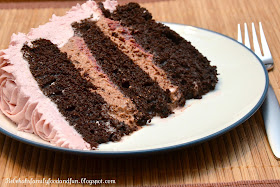 After a bit of deliberation, I decided the raspberry filling wasn't thick enough to be a sufficient filling between the layers, so I added a chocolate mousse copied from this cake.